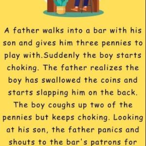 A father walks into a bar with his son and gives him three pennies to play with. Suddenly the boy starts choking. The father realizes the boy…