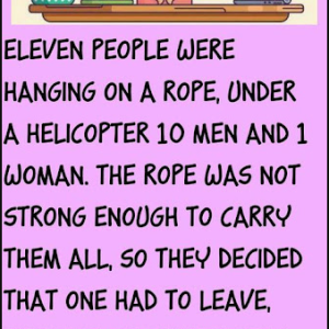 Eleven people were hanging on a rope, under a helicopter 10 men and 1 woman. The rope was not strong enough to carry them all, so they…