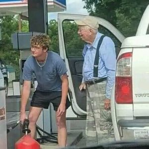 Beautiful ❤️ This teenager was filling up his Mustang when the older gentleman pulled up with his can for the mower and was patiently waiting. The teenager…