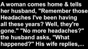 A woman comes home and tells her husband, “Remember those headaches I’ve been having all these years? Well, they’re gone.” “No more headaches?” the husband asks, “What…