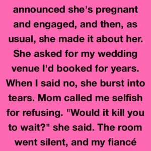 At a family BBQ, my sister announced she’s pregnant and engaged, and then, as usual, she made it about her. She asked for **my wedding venue**—the one…
