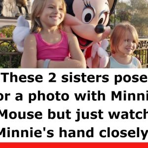 These two sisters pose for a photo with Minnie Mouse, but they keep a watchful eye on Minnie’s hand.